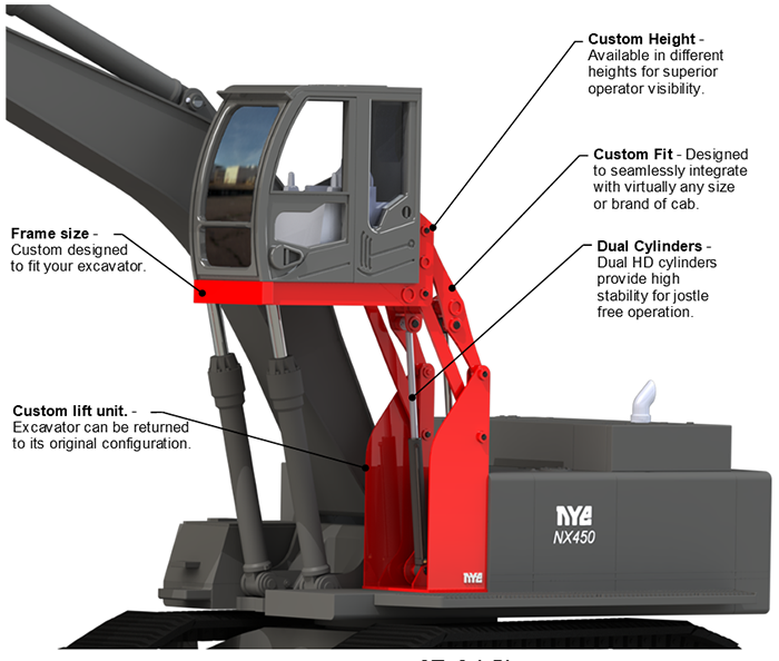 Each Nye CTL Cab Riser is custom designed to fit your excavator, ensuring exceptional fit, finish, performance, and maximum safety and stability.
