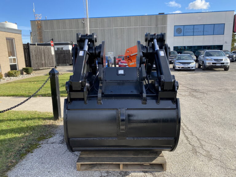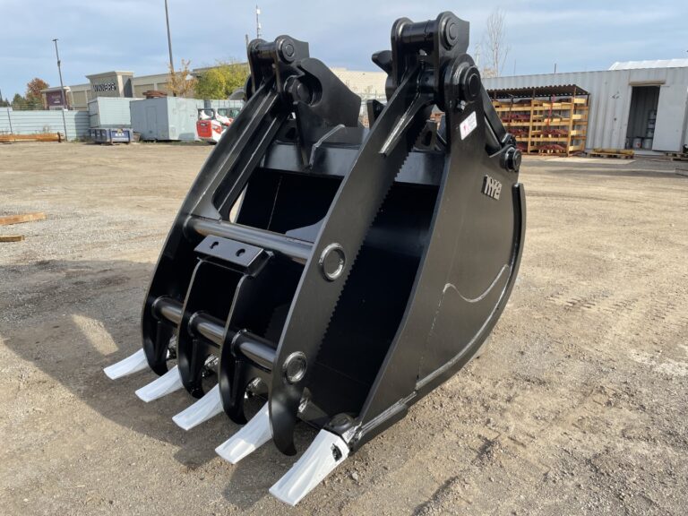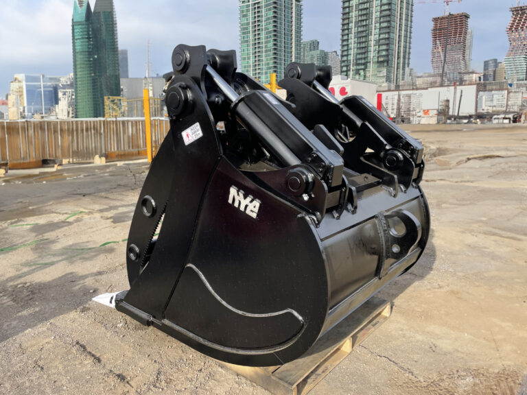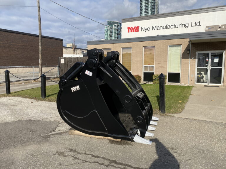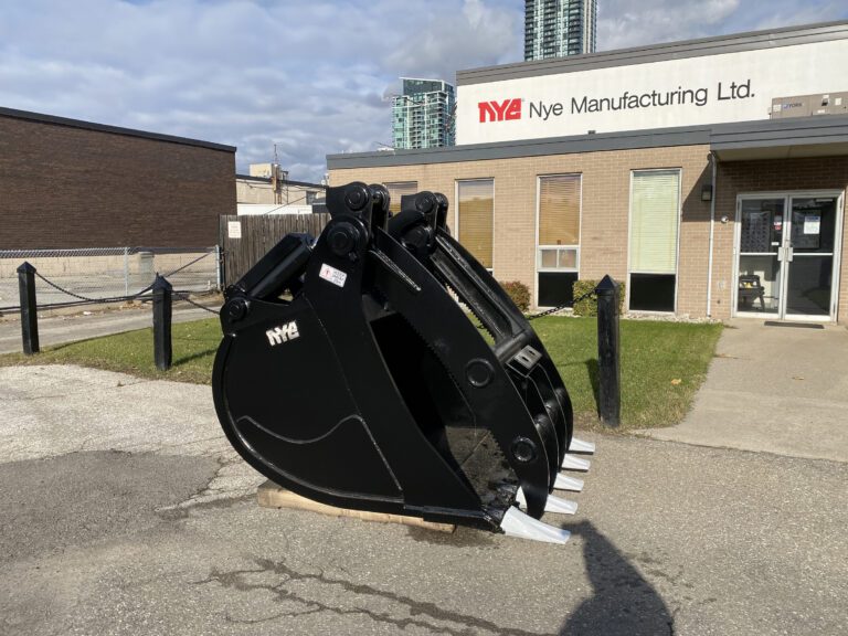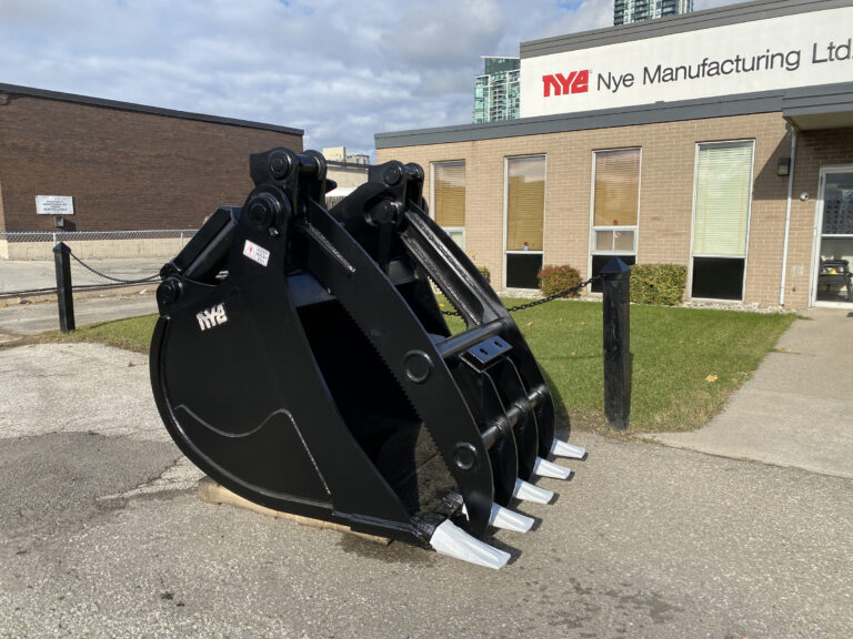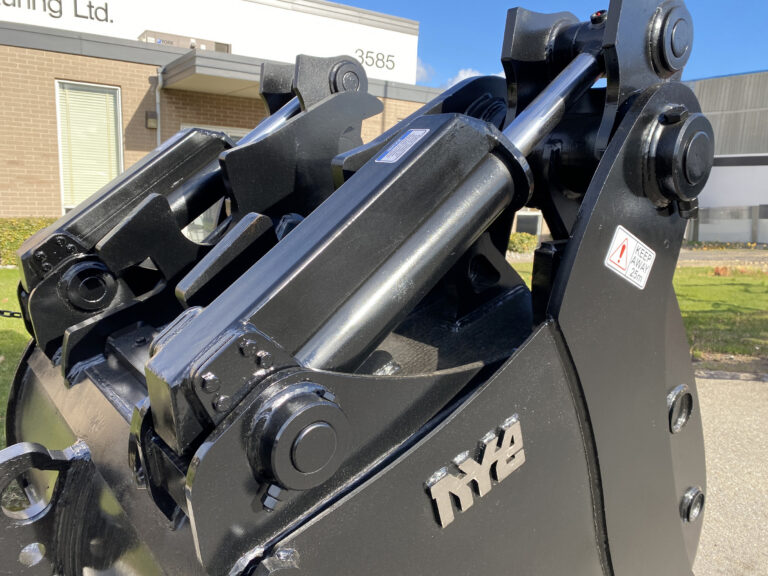 Jack Nye invented the hydraulic grapple bucket over 30 years ago. Our latest EXG series “Mantis” buckets feature twin hydraulic cylinders with a single thumb and tines that mesh with the bucket teeth. A strong bumper pad engages the stick providing maximum range of motion with minimal interference for digging.