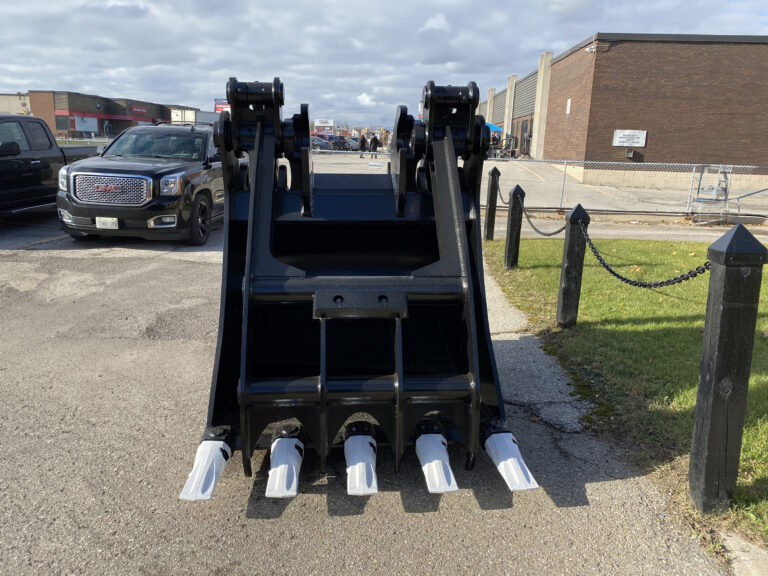 The open cylinder design eliminates binding with stones and frozen mud. Servicing is simple. There are no linkages or complex “cuckoo-clock” rotary actuators, no sliding rotary seals or internal splines, no gears to grind and smash. In the open position, the cylinders extend in hydraulic relief as the tine pad contacts the excavator arm during bucket curl.