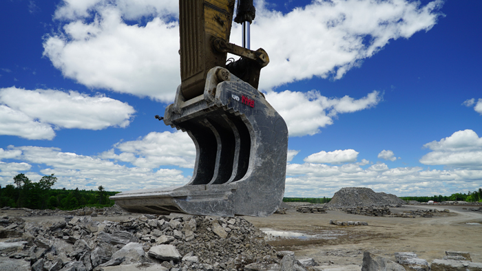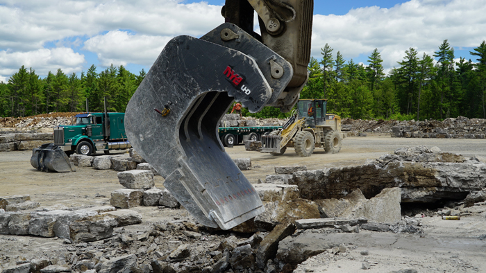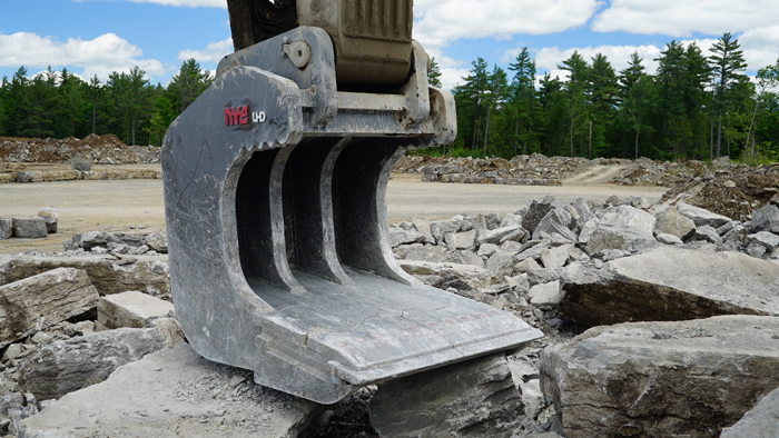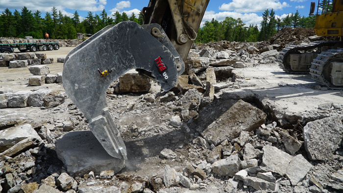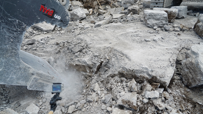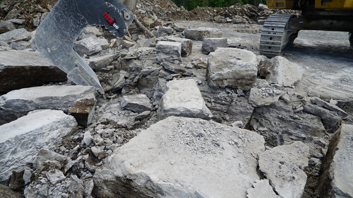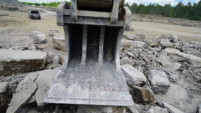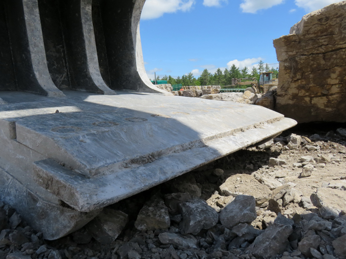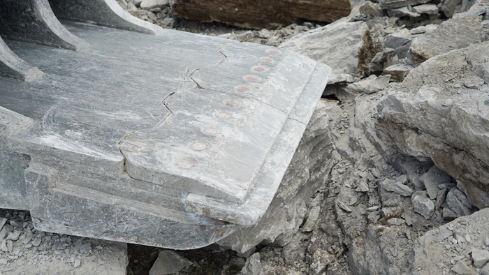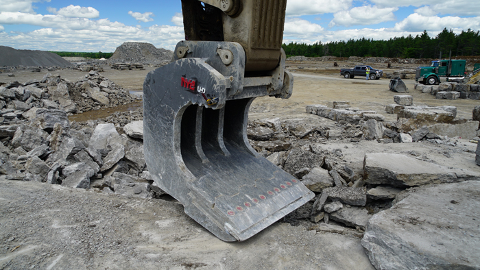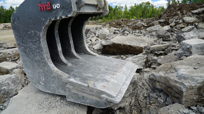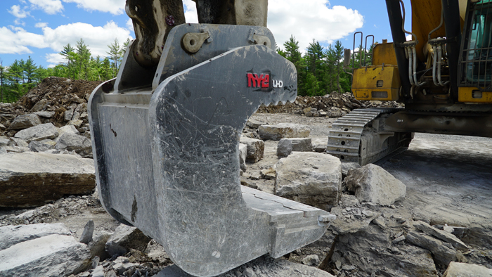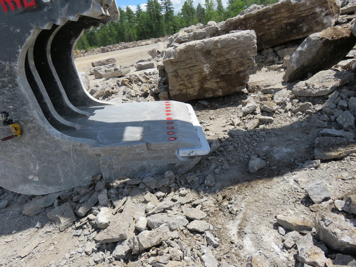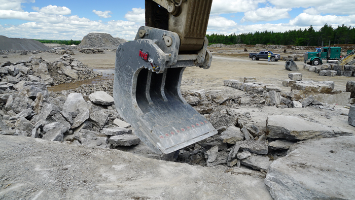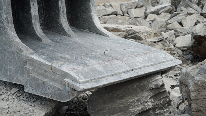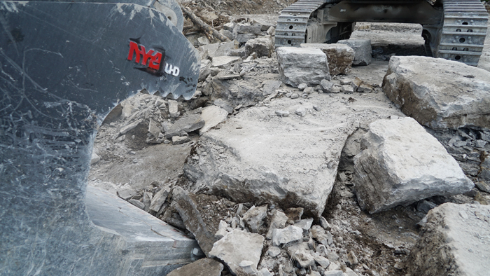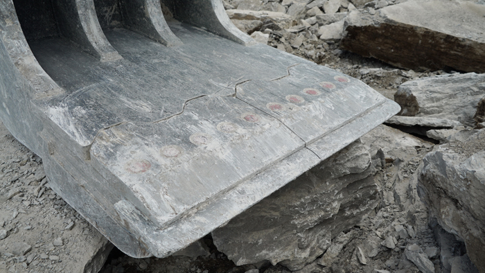 With a heavy bucket and sharp edge the operator can separate layers of rock easily by pounding the cutting edge into seams and cracks. The mass of the bucket does the work, not the excavator, like a man using a sledge hammer delivering powerful blows with no injury to himself.