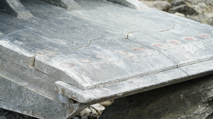 A sharp cutting edge is crucial for splitting and separating layers of sedimentary rock. Conventional welded cutting edges with flame cut bevels tend to dull quickly, impacting performance and production. Changing a welded cutting edge is costly and time consuming, requiring special skills and equipment plus extended machine down time.