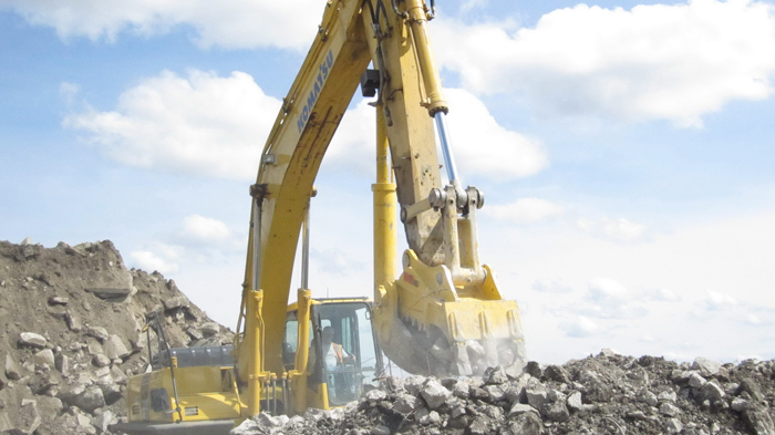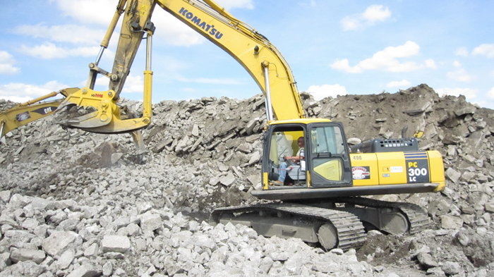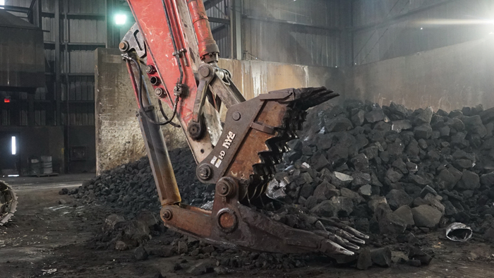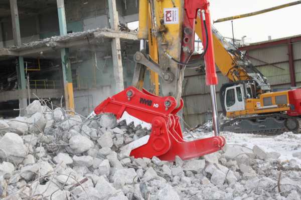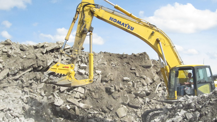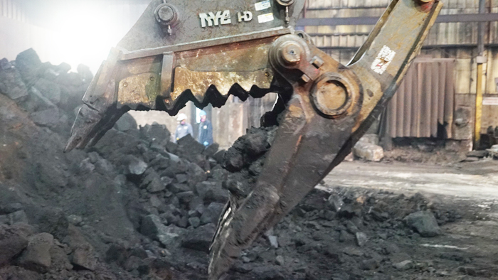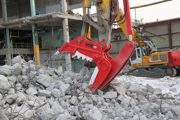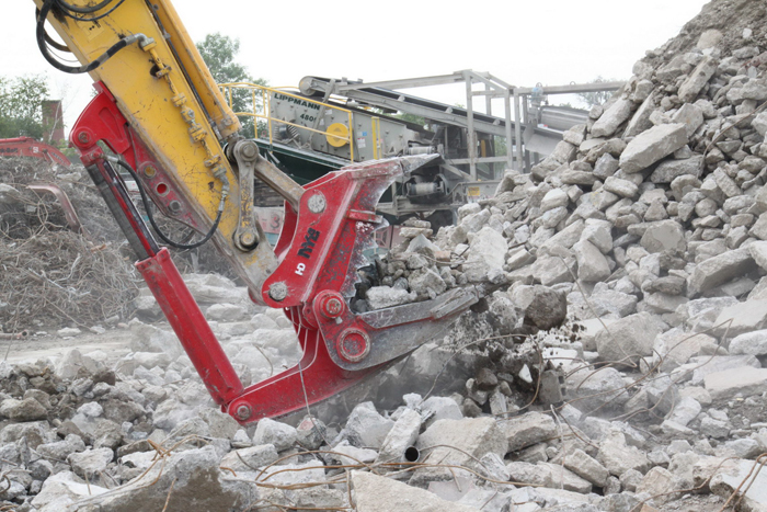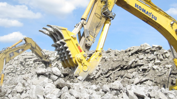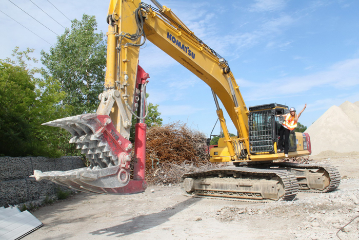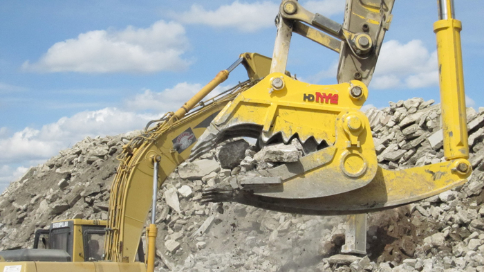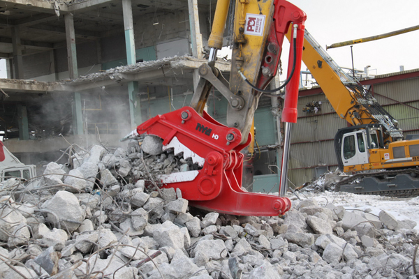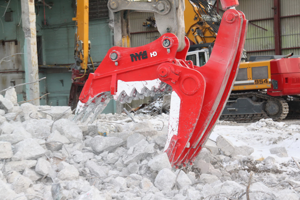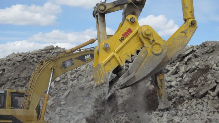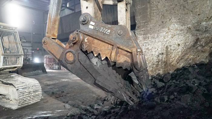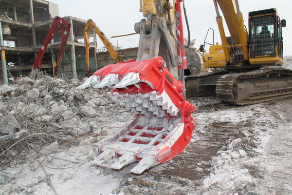 The T-Rex has multiple uses on a job site. It includes, but is not limited to, precision picking and sorting of reclaimable materials, using it as a shovel to dig through debris piles, and separating reinforcing rod from concrete demolition debris.