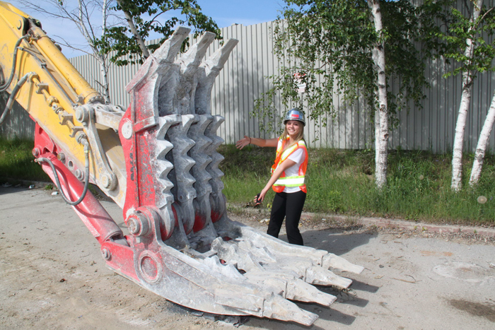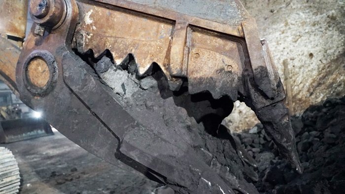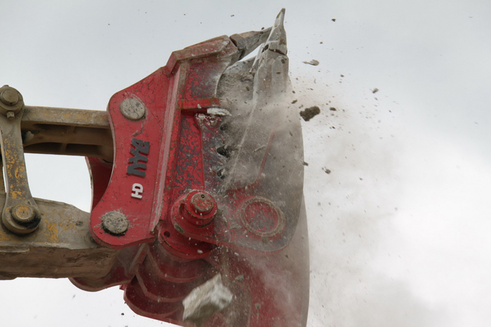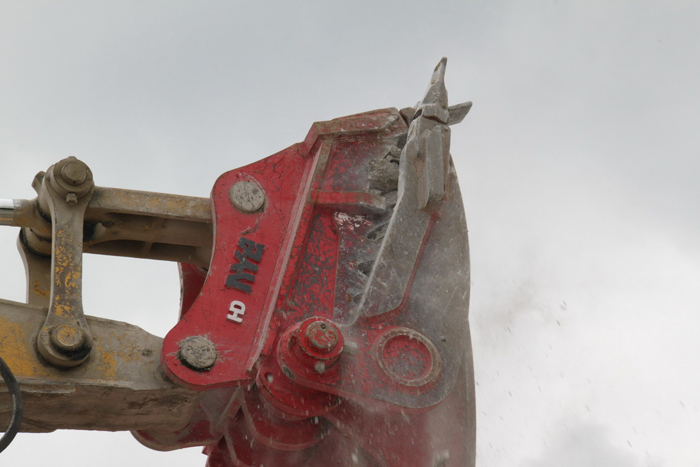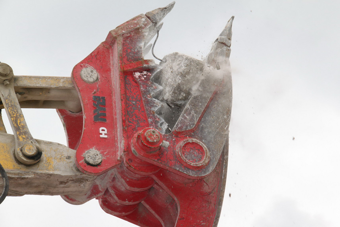 The lower and upper meshing and replaceable incisors intersect tip to tip. This provides a fine point of pick-up for smaller items, like bits of re-bar that tend to contaminate the concrete pile.