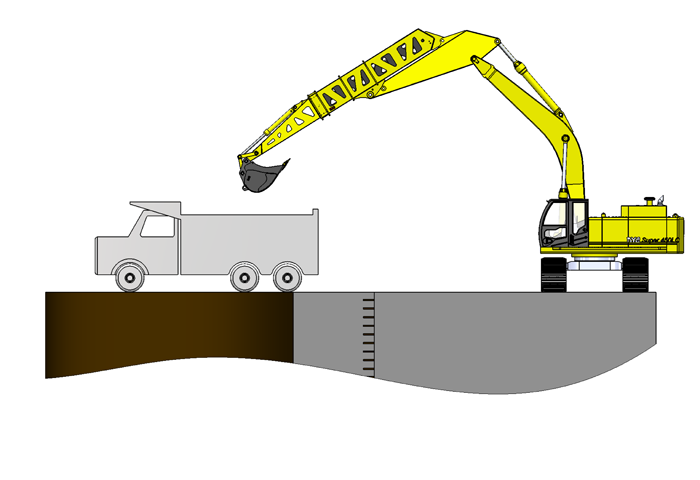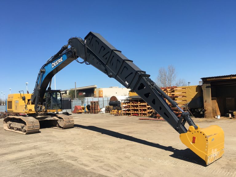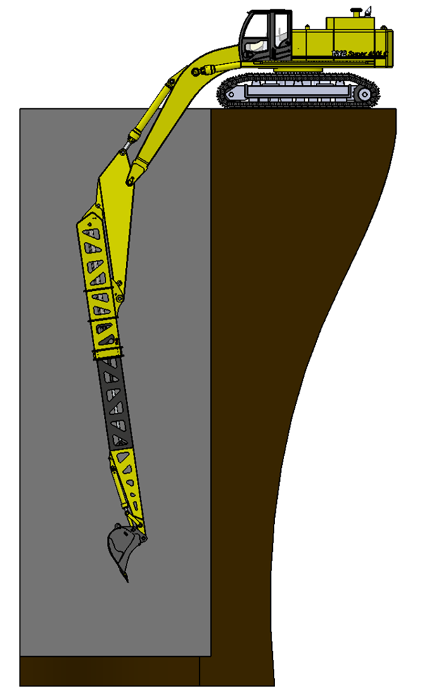 Designed for deep excavating, ditching, dredging and pond work. Nye telescopic stick extensions pin-on in place of the OEM bucket, cylinder and linkages. No cutting or welding required. QT100 quenched and tempered structural steel construction for maximum strength and minimum weight. Available for excavators ranging from 20 to 85 tons.