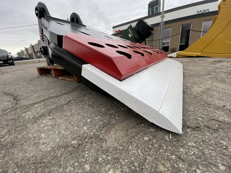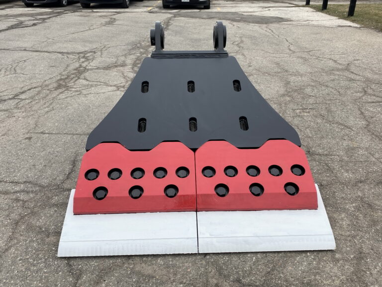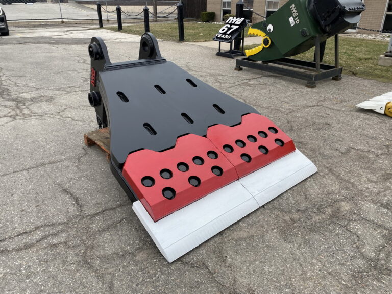 This is a tool that quickly cuts, and trims dimensional limestone. The TMK design is based on our customer’s own ideas. A 7″ thick solid steel baseplate, and 11,000 pound gross mass helps the TMK slice through thick slabs easily, without pounding the carrier.