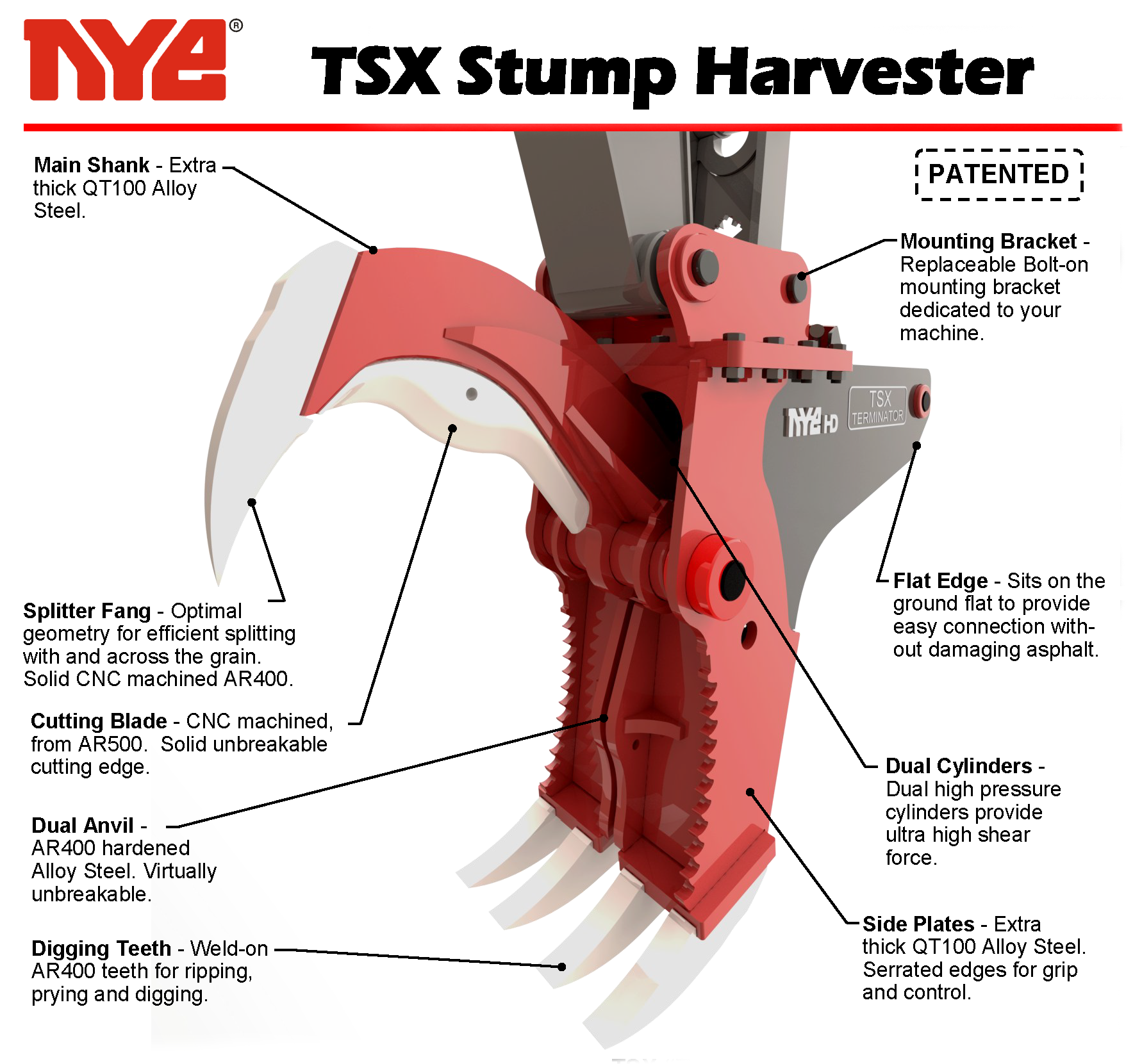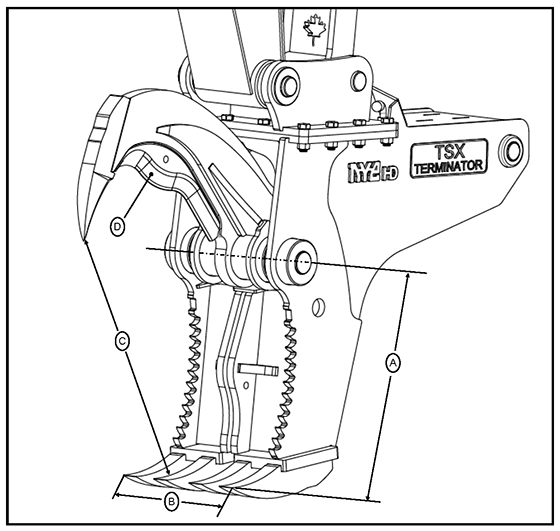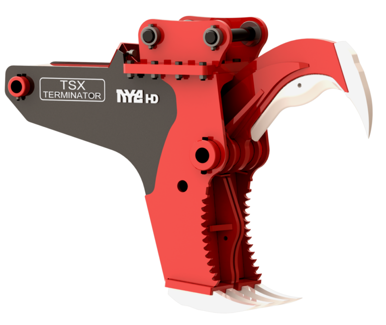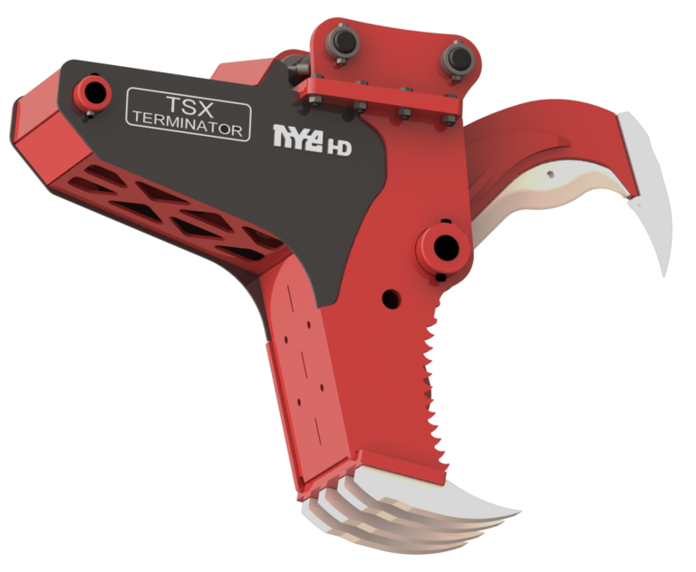 TSX “Terminator” Hydraulic Stump Harvester, with heavy-duty blade, fang, and anvil geometry taken from our proven SHX design. The TSX gives high performance combined with self-contained mounting that does not interfere with existing thumbs and stick mounted equipment.